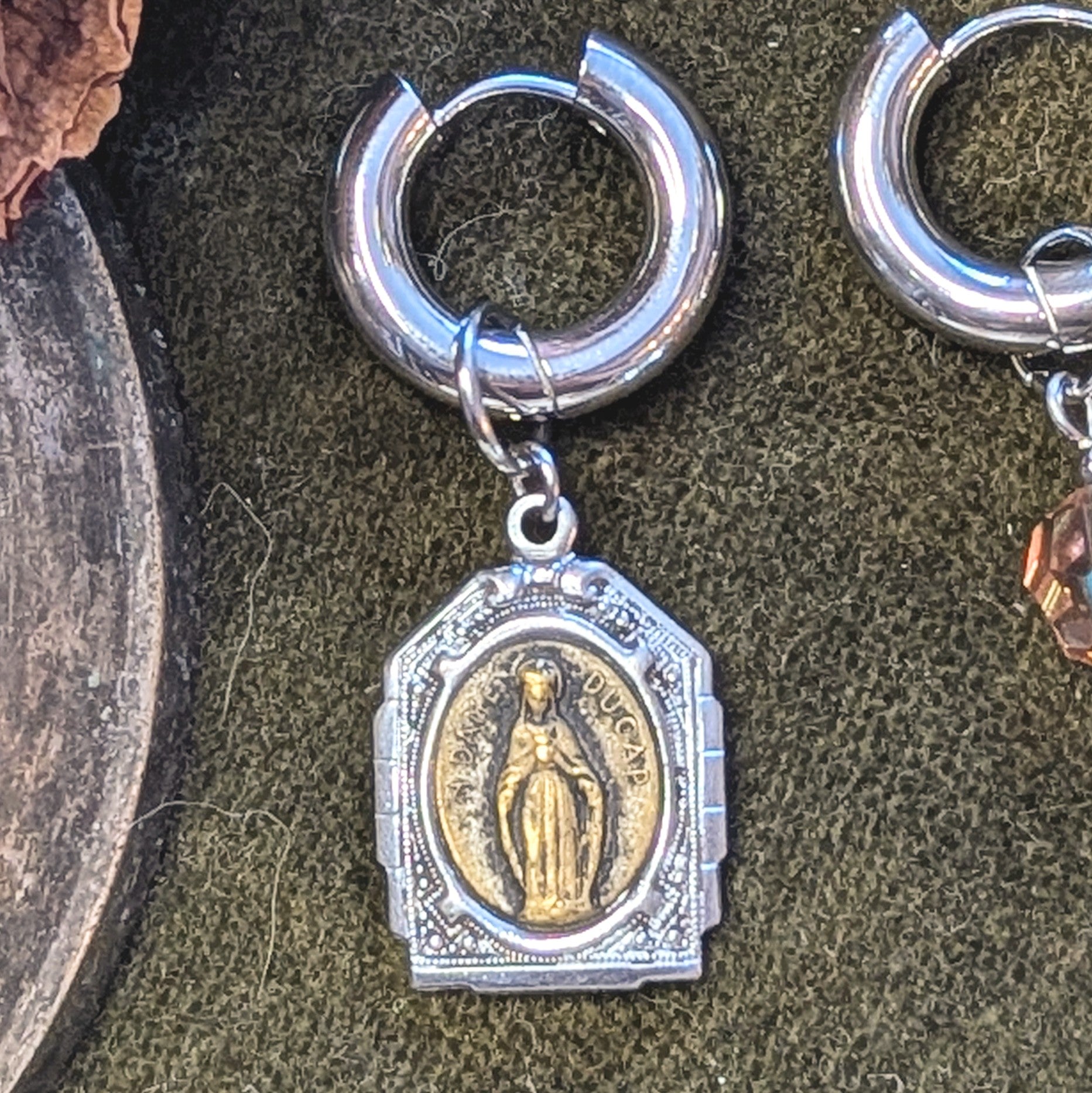 La breloque religieuse probablement en argent et les perles (une perle de grenat) ont été récupérées sur d'anciens bijoux qui dormaient dans une friperie ou ailleurs. Elles ont été revalorisées dans cette création afin de leur donner une seconde vie grâce à vous.